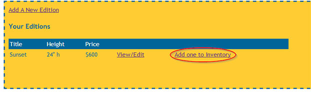 - To add a new piece to the eddition, return to your editions page and click on the "Add one to Inventory" link next to the piece you wish to add.