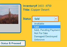 On the "Update the Status of Sold Artwork" page you will have the opportunity to change the inventory status of the artwork you have just sold. This update will change the availability of the artwork in your ARTsala records, and will also update the status of the artwork on your website if you have an ARTsala website.