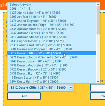 On the "Select Artwork & Record Payments" page, you will select the artwork your client is purchasing. There are two ways to do this. The first is to use the "Select Artwork" drop-down menu, and click on the artwork you wish to sell to the client.