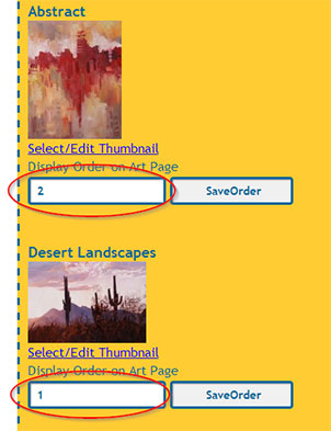 Next, set the order the subjects will appear on your art page. The default is for the subject matter to appear alphabetically. If you wish to have a custom order, enter numbers in the order field in the order in which you would like the subjects to appear. The art page will sort the subjects from lowest to highest by the numbers you enter. Be sure and click the "Save Order" button after you enter each number.