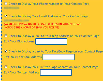 - Next, you can decide if you want your phone number, email address, and social media links to appear on the site. The contact page has a mail form that visitors can use to email you, so we recommend that you not display your email address on your website. Displaying your email address can dramatically increase the amount of spam you receive.
