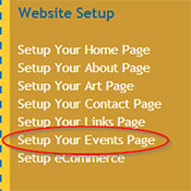 You may announce your upcoming events on your ARTsala website. This is the perfect way to let your followers know about upcoming shows and other events. The best part is that ARTsala will automatically remove events from your site once they are over, and the events page and link hide if there are no upcoming or current events.