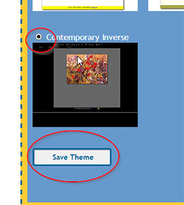 - Finally, you may select the theme for your website. The theme will act as a kind of skin for the website and will determine the appearance of the website. You may select your theme by clicking on the image or radio button next to the theme, and click "Save Theme".